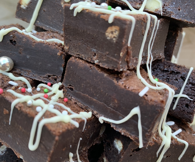 A stack mountain high, of our ridiculously rich, triple chocolate brownies. Drizzled with white chocolate and topped with sprinkles. Perfect for birthdays and celebrations. Your choice of chocolate or sweets can also be added on. Included in the price. Comes gift wrapped.